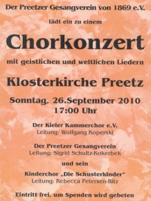 Das Chorkonzert des Preetzer Gesangvereins am 26. September 2010 war ein voller Erfolg für die beteiligten Chöre! Alle Plätze in der Kirche waren besetzt und es wurde noch zusätzliches Gestühl herbeigeschafft, um allen Interessierten die Teilnahme zu ermöglichen. Das umfangreiche Programm bot für jeden Geschmack etwas. Es wurden Volkslieder, Spirituals und Musical-Melodien gesungen und auch plattdeutsche Chorsätze fehlten nicht. Besonders beeindruckend war das Händel-Werk "Dir will ich singen" | ||||||